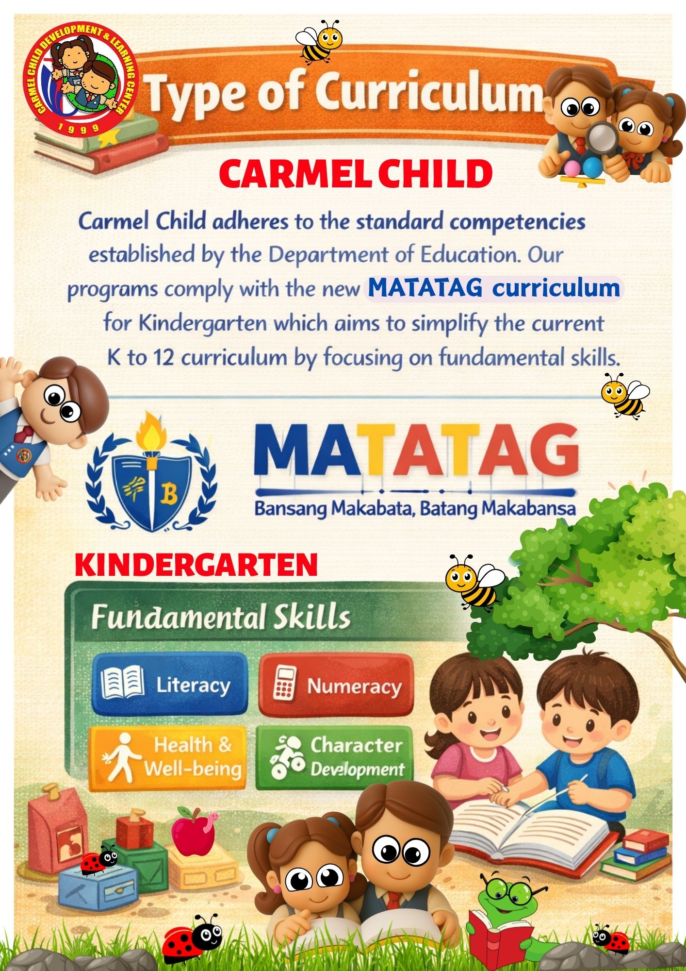 Carmel Child adheres to DepEd standards and the MATATAG curriculum for Kindergarten, focusing on fundamental skills.