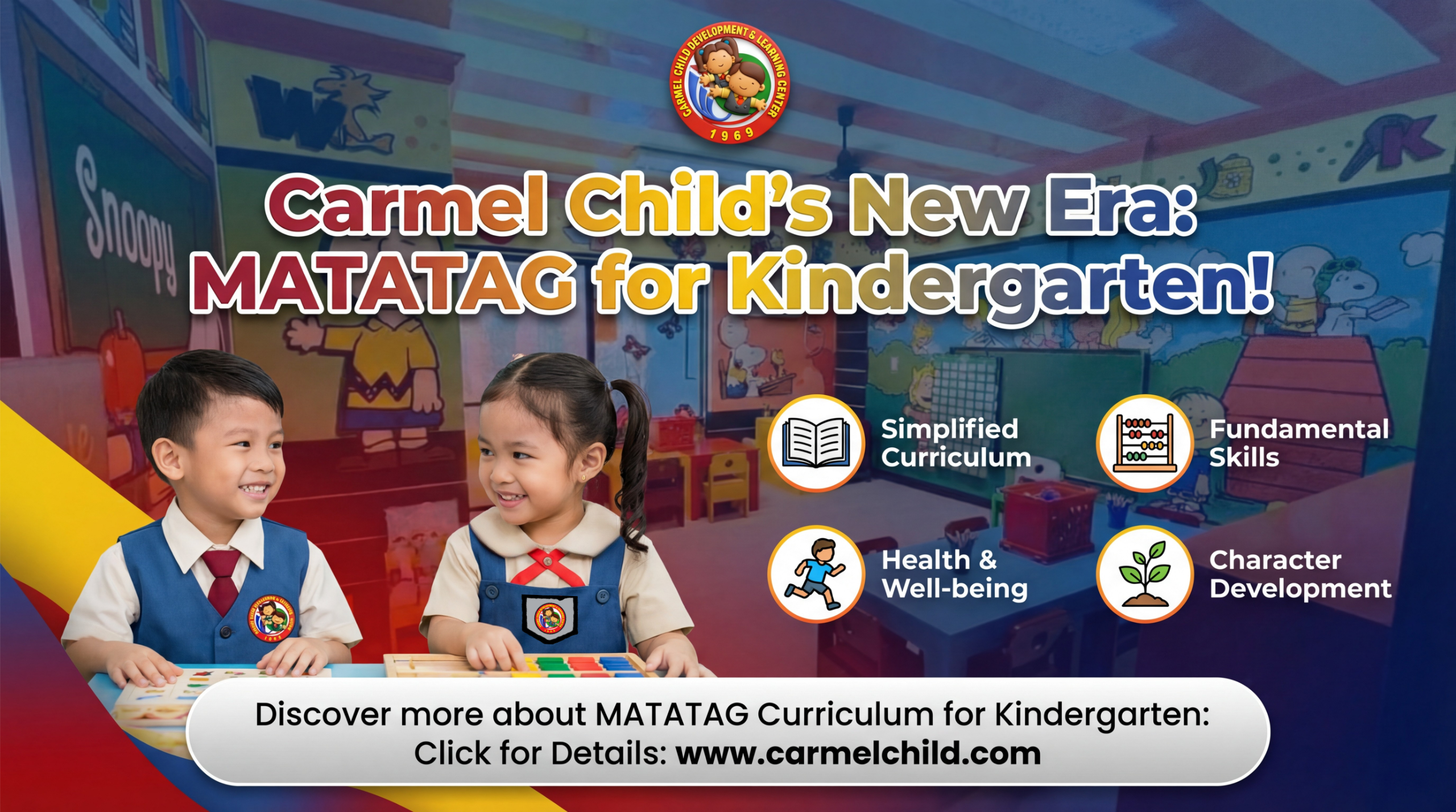 Carmel Child adheres to DepEd standards and the MATATAG curriculum for Kindergarten, focusing on fundamental skills.